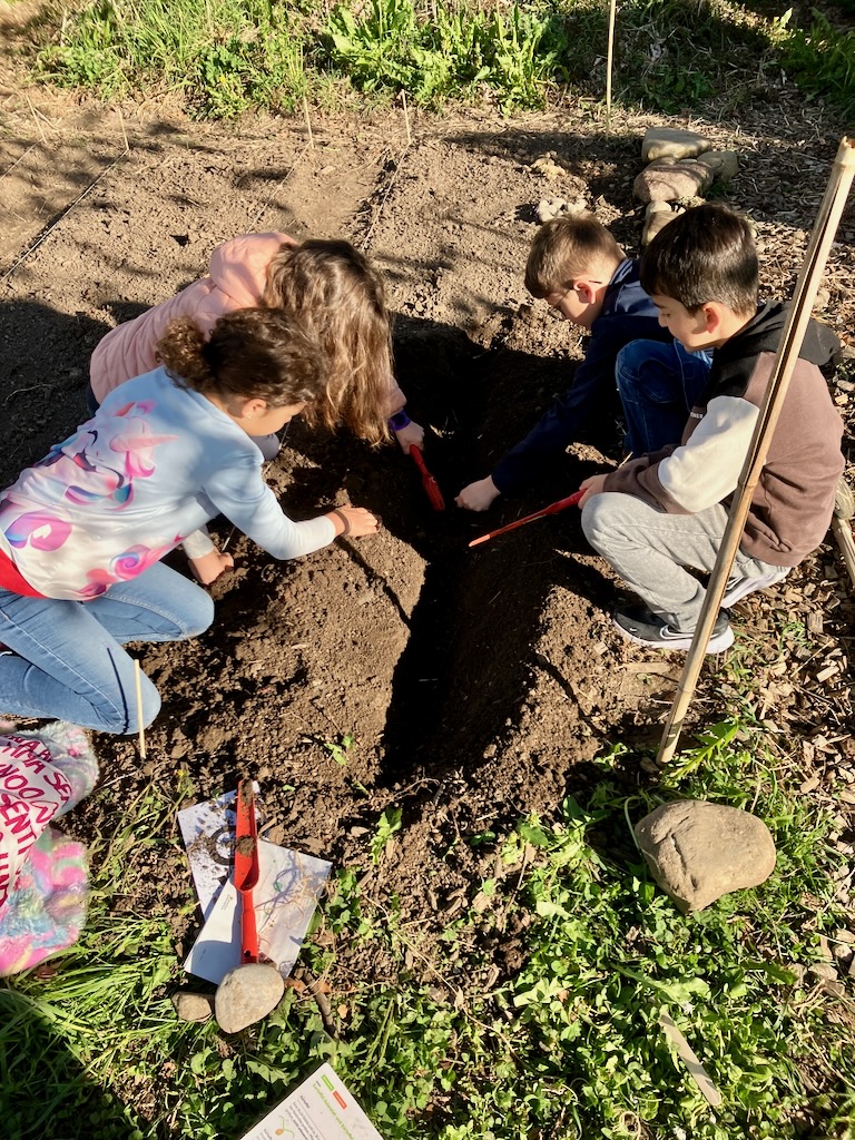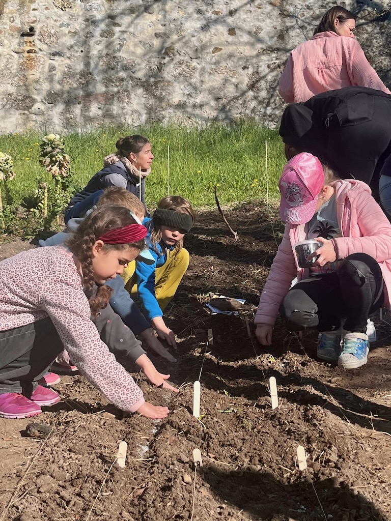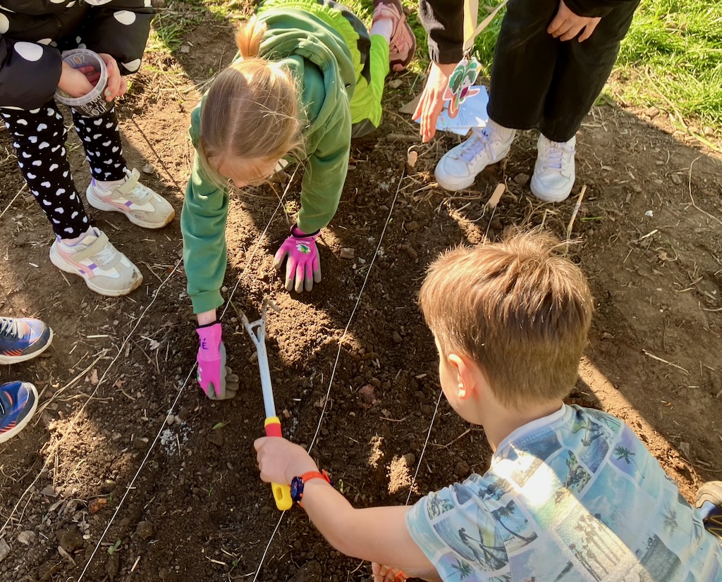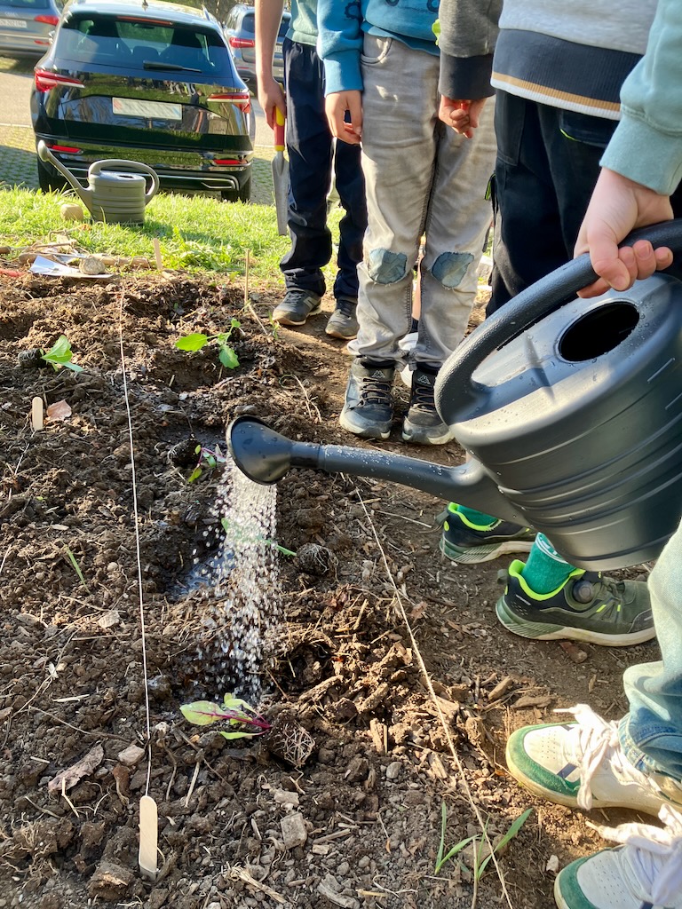 Mit grosser Begeisterung machten sich die Kinder unter der Anleitung der AckerCoachinnen an die Arbeit und schon bald waren so ziemlich alle Hände schmutzig. Gemeinsam wurden Setzlinge gepflanzt und sorgfältig in die vorbereiteten Beete gesetzt. Auch Samen wurden in die Erde gestreut – in der Hoffnung, schon bald die ersten grünen Spitzen zu entdecken.